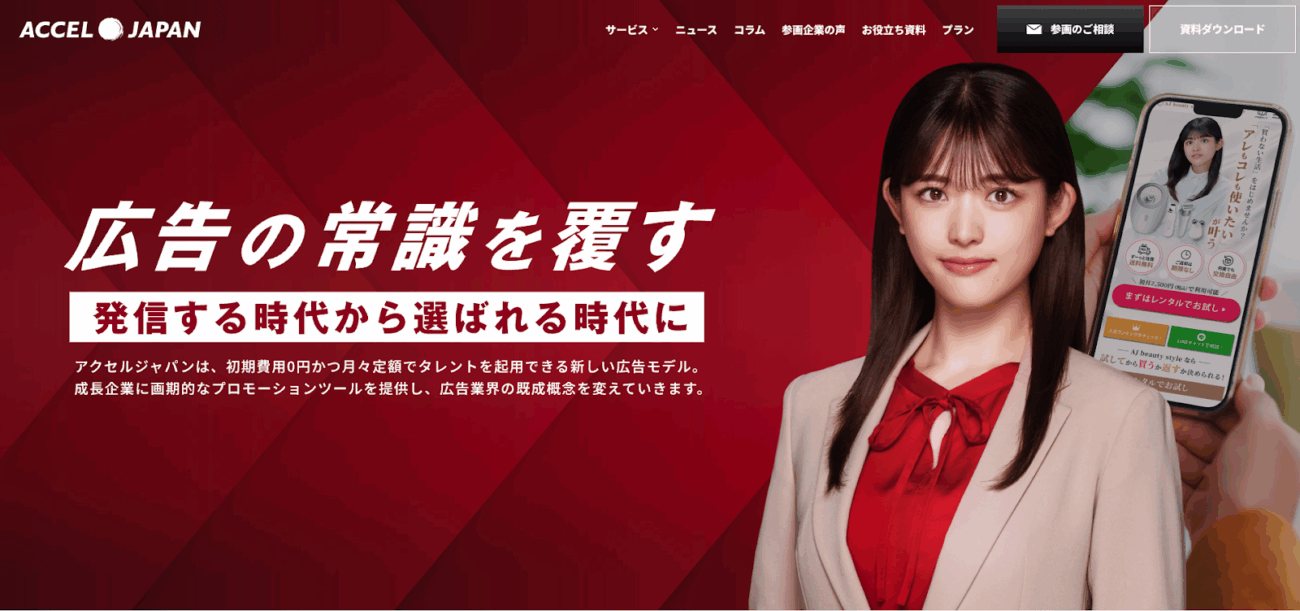 アクセルジャパンは、著名タレントの肖像素材(写真・動画)を定額制で提供する広告支援サービスです。