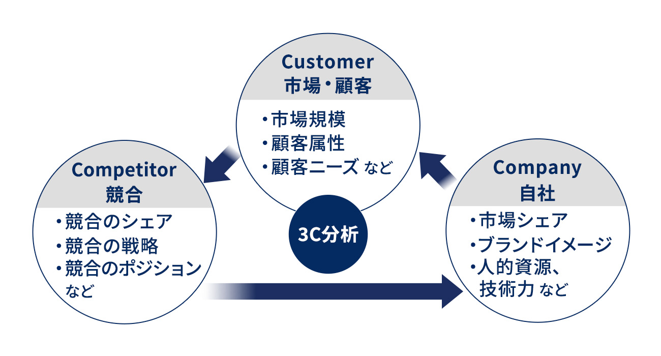 - Customer(市場・顧客):市場規模、成長性、顧客ニーズの変化