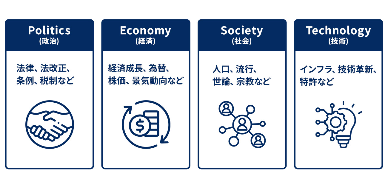 - Politics(政治):法規制、税制改正、政権交代、国際情勢
