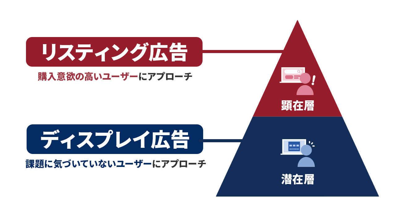 一方、ディスプレイ広告はまだ商品を知らない、あるいは課題に気づいていない潜在層にアプローチできる点が大きな特徴です。