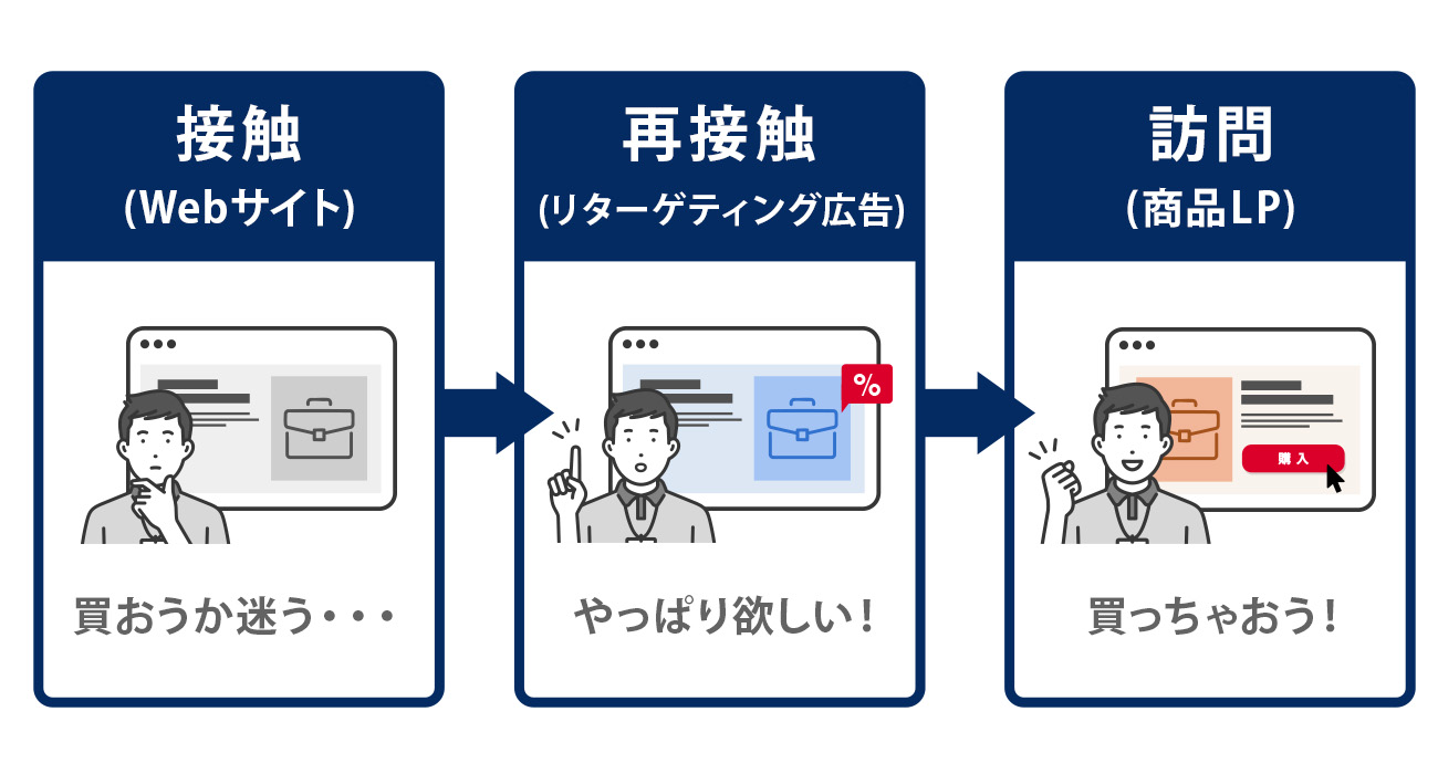 この手法が重要な理由は、サイト訪問者の大半が初回訪問では購入や問い合わせに至らないためです。一度興味をもったユーザーに繰り返しアプローチすることで、比較検討期間中も自社を想起させ、コンバージョンにつなげられます。
