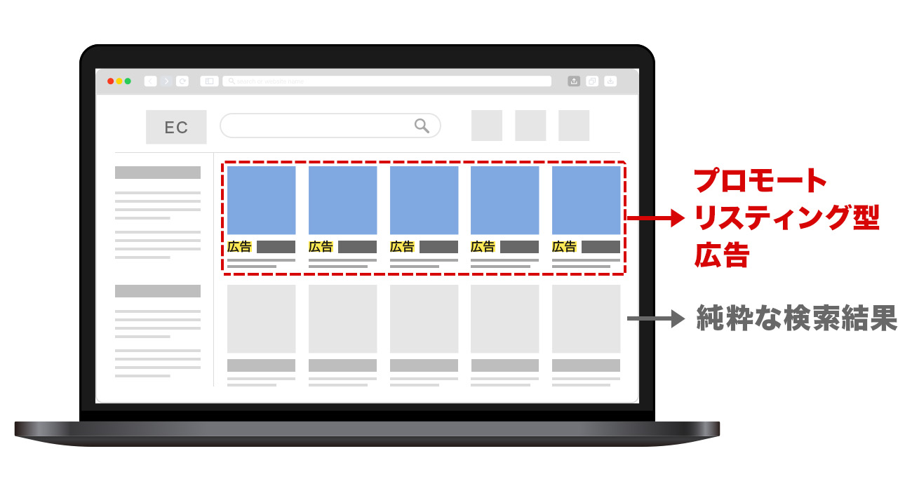 プロモートリスティング型は、ECサイトやグルメサイトなどのサイト内検索結果に表示される広告です。