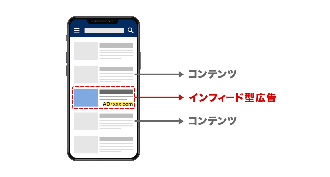 インフィード型は、SNSのタイムラインやニュースサイトの記事一覧など、コンテンツとコンテンツの間に表示される広告です。