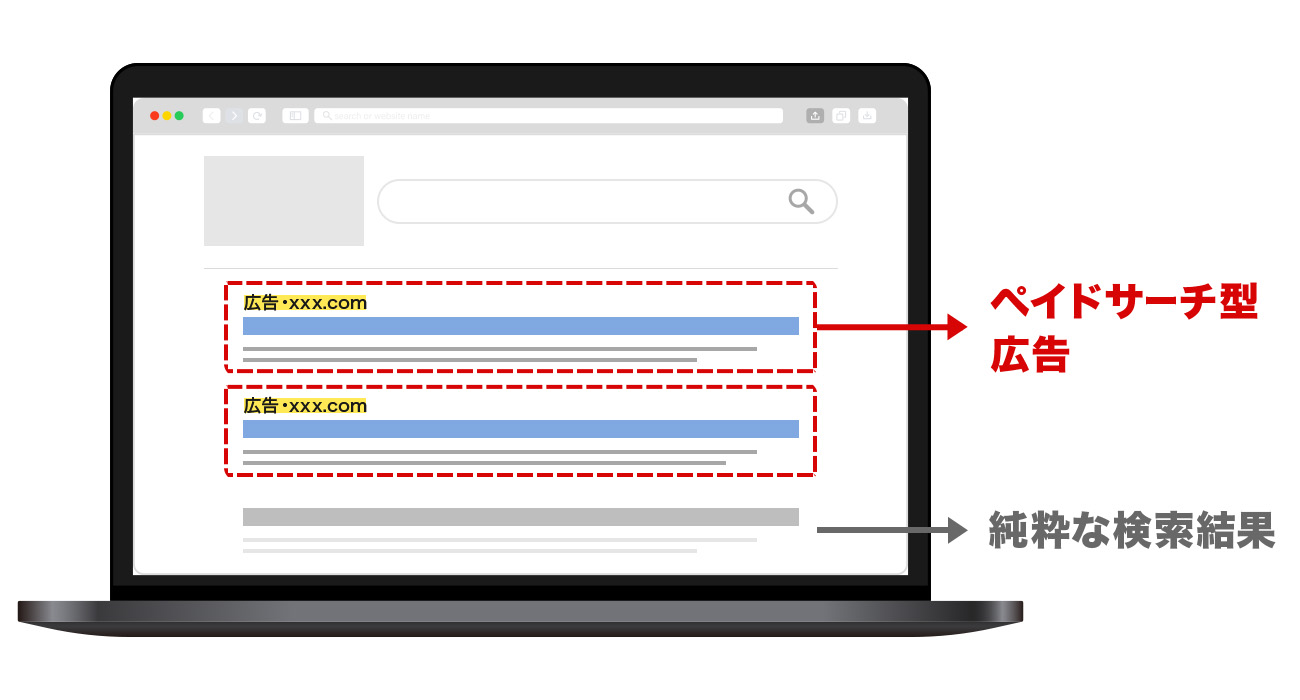 ペイドサーチ型は、GoogleやYahoo!などの検索エンジンで、検索結果の上部に表示される広告です。いわゆる「リスティング広告」がこれに該当します。