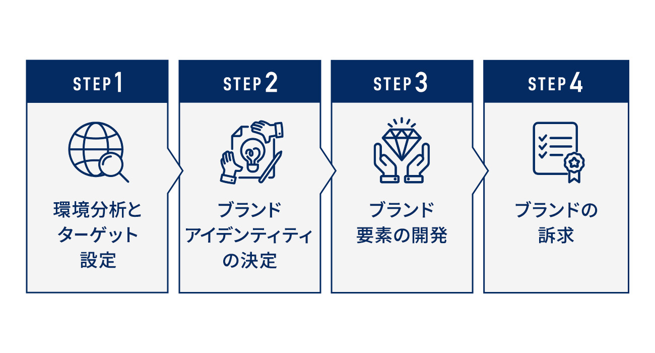まず、市場環境の調査・分析を行い、自社の資源や強みを明確にします。競合他社の動向や顧客ニーズを把握したうえで、ブランドを訴求するターゲットを絞り込みます。