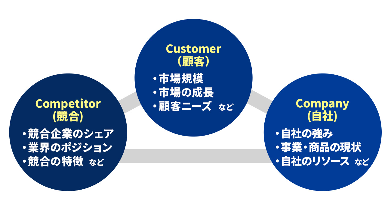 顧客の「ニーズ・購買行動」、競合の「強み・戦略」、自社の「経営資源・強み」を整理することで、市場における自社のポジションを明確にできます。