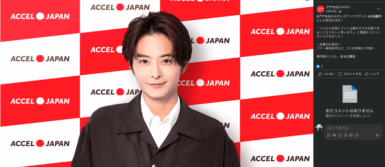 企業アカウントでの情報発信例として、「ACCEL JAPAN(アクセルジャパン)」ではタレントサブスクリプションサービスのアンバサダーとして参加いただいた有名タレントの情報を、FacebookとX(旧Twitter)にて発信しています。