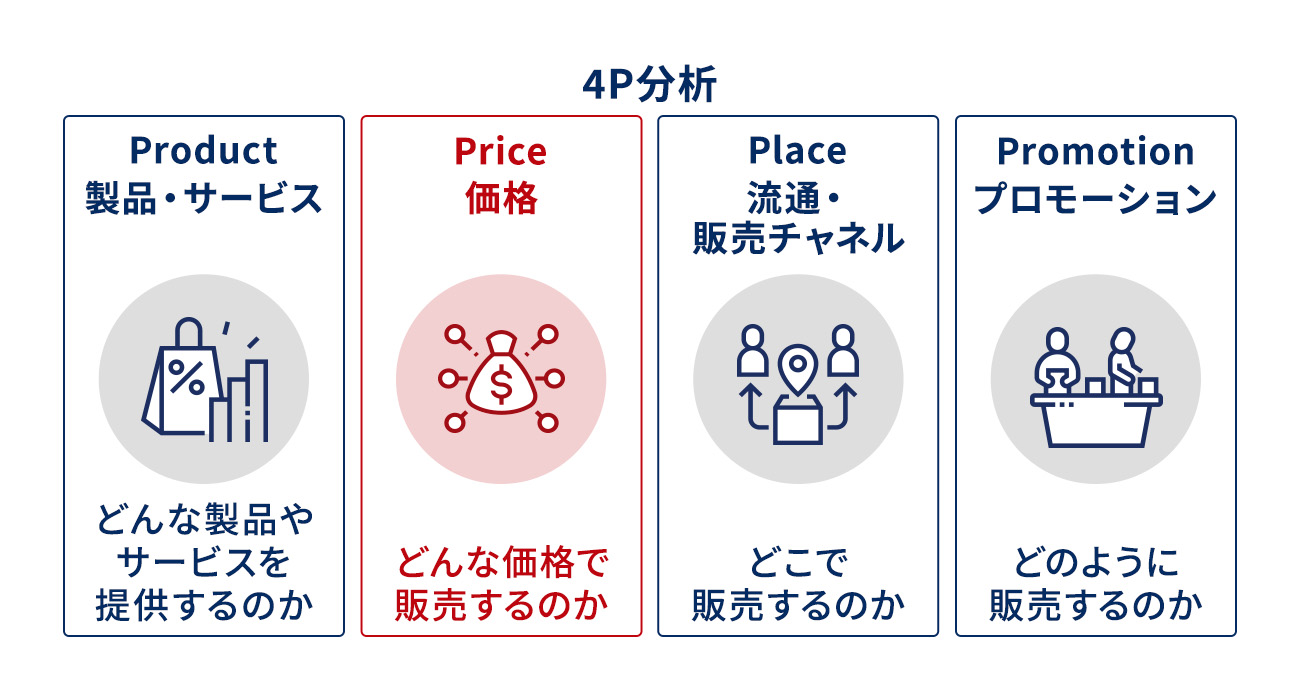 Priceでは、製品やサービスの価格設定を検討します。価格は顧客の購買意欲に直接影響を与えるだけでなく、ブランドイメージや利益率も左右する重要な要素です。