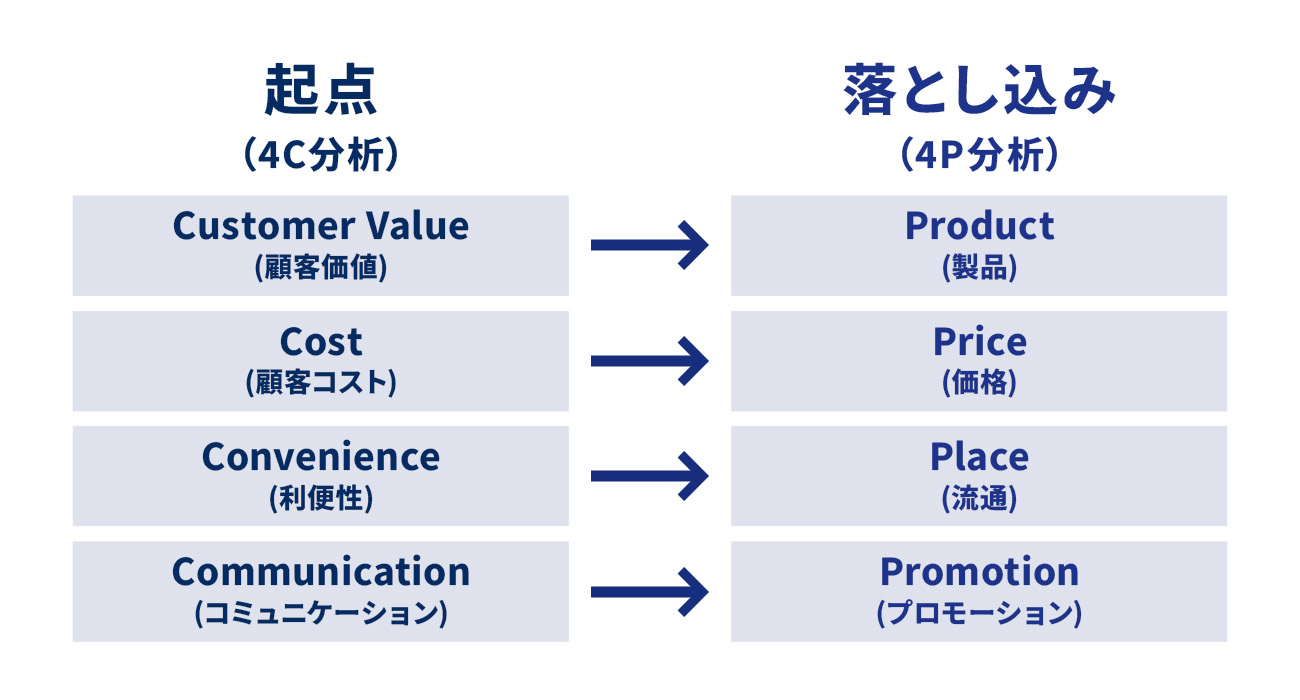 上記より、4P分析は企業視点の、4C分析は顧客視点の評価軸というのがわかります。