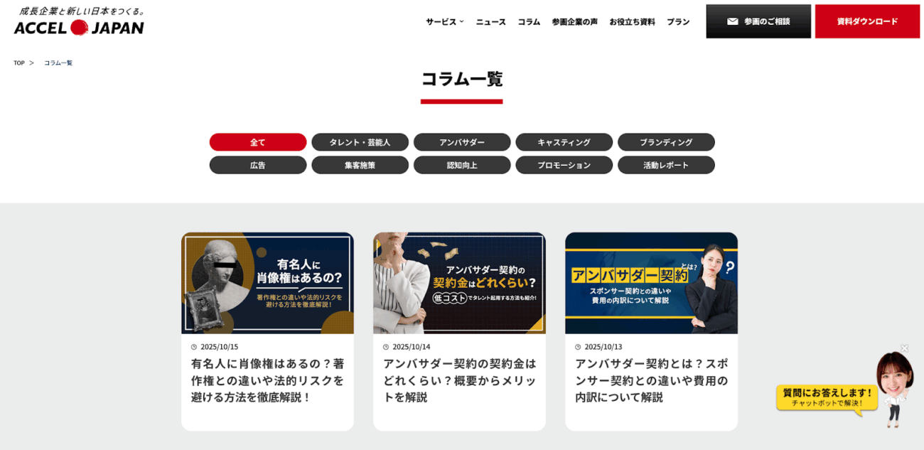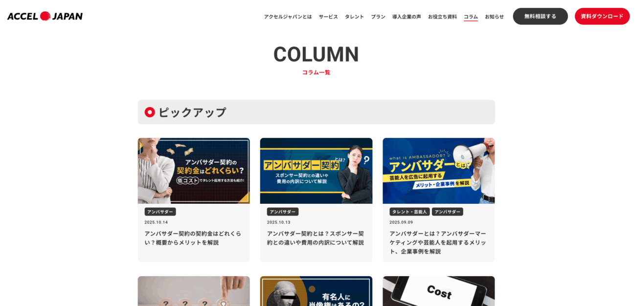 たとえばアクセルジャパンでは、有名タレントの写真や動画素材を利用できるプロモーションツール「タレントサブスク」を提供しているので、サービスに関する記事はもちろん、ブランディングやプロモーションを主軸としたマーケティングのノウハウを本メディアにて発信しています。