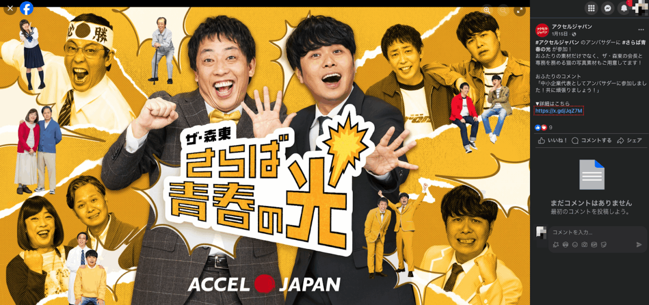 具体例として、アクセルジャパンではFacebookやX(旧Twitter)を運用して、タレントサブスクサービスのアンバサダーとして参加していただいた有名タレントの情報などを発信しています。下記は「さらば青春の光」さんが参加された時の投稿例です。