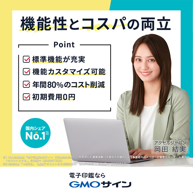 2023年11月下旬より「お名前.com byGMO」と「GMOサイン」が開始する期間限定LPにアクセルジャパンの提供する画像素材が使用されました。GMOインターネットグループとGMOグローバルサイン・HDは、アクセルジャパンアンバサダーで、女優・タレントの岡田結実さんを起用したPRツールを活用し、登録実績3,000万件を突破している、国内シェアNO.1の「お名前.com byGMO」の更なるシェア拡大と「GMOサイン」のさらなる普及を目指します。