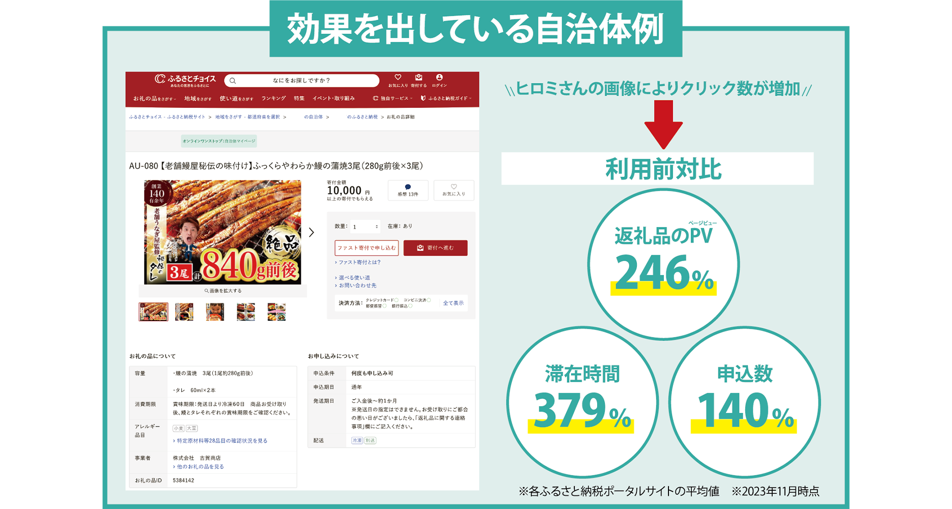 ある自治体がふるさと納税ポータルサイトで広告物を使用した際には、ページビュー数が使用前に比べ246%、滞在時間は同379%、申込数は同140%と大きな効果が表れたという。寒川取締役によると「『あの自治体が急に伸びたので不思議だったが、そういうことだったのか』と話すポータルサイト関係者もいる」という。記事制作日:2024年3月13日